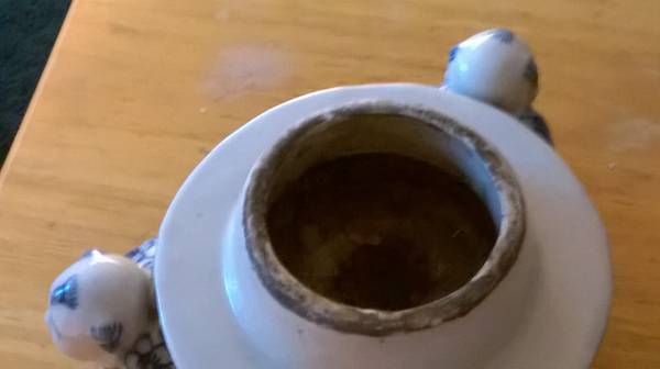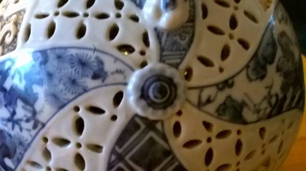 This exquisite blue and white porcelain and rose sandstone carved 13" globe incense burner was purchased 2nd hand in Kyoto, Japan 1952. When I got it appraised we questioned whether it might have come from China originally. Both cultures have Foo Dog/Lion in much of their art. And the "coolies" carrying the world on their backs (notice the fine detail of their fingers!) But it was determined that is is from Japan originally and was appraised at $1200. I am firm at $1000. Must see it to enjoy the detailed pics in each swirl.