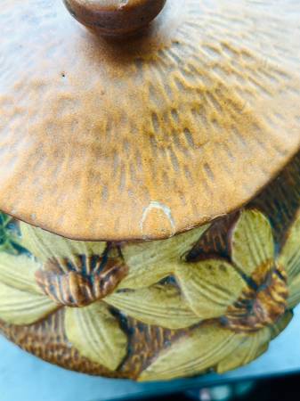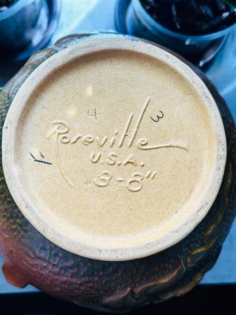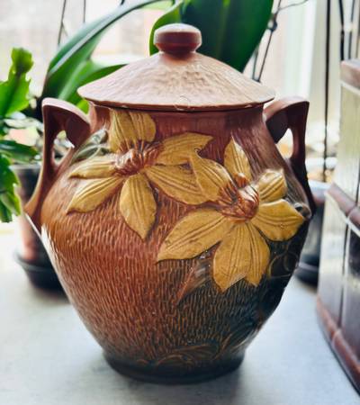 Large Roseville pottery cookie jar for sale. Very cute in a retro kitchen one chip on the lid as shown in one of the photos.
