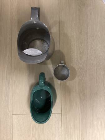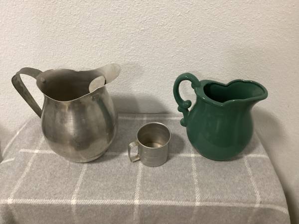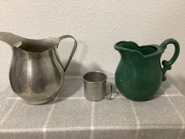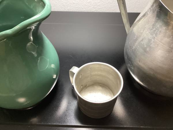 You get all 3 items for $15 total Vintage Pitchers and Vintage Tin Cup. My family member told me these have been her mother’s family for many years and I am selling them for the family. Hoping...