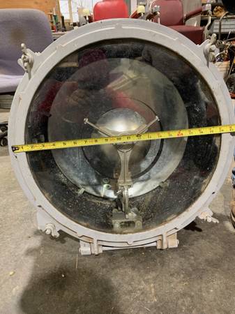 Early 20th century Westinghouse spotlight. This massive spotlight bears the Westinghouse logo. All heavy aluminum construction. The lense measures 21” in diameter. It does have a patented arc light but the actual filament is missing. It can be converted to conventional bulb. The lense is plexiglass, but appears to be original or has been on there for a very long time. It came off an old navy vessel many years ago when my grandfather worked at the SF shipyard.