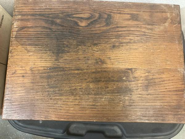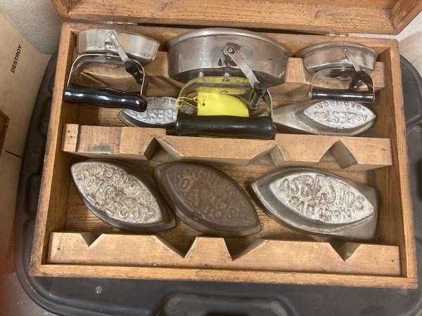 Antique Iron Set in wood case. Six different weight sizes and three holders.