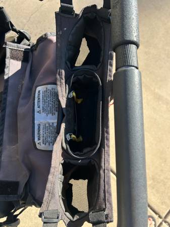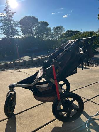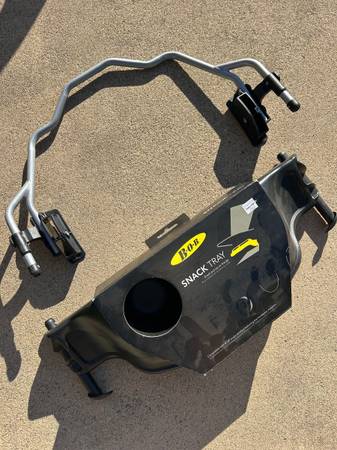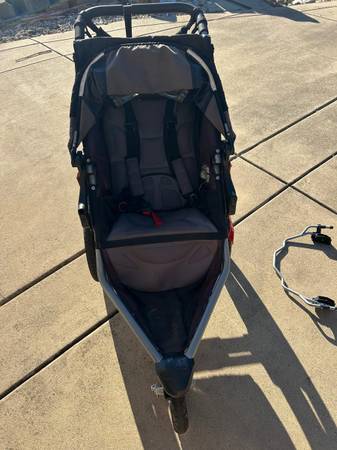 Single BOB Stroller. Comes with upper handlebar attachment with drink holders and small compartment and a snack bar attachment for rider.