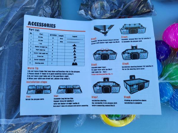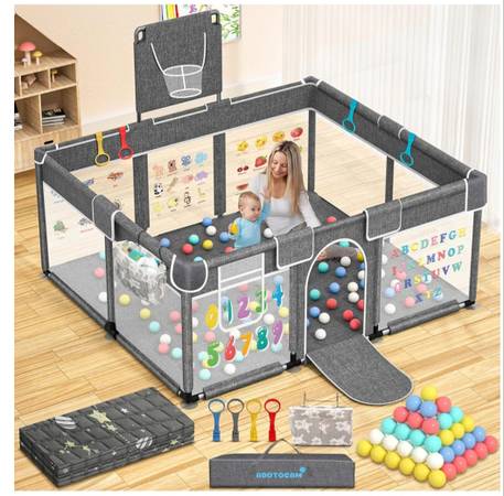 The size of the playpen is 71 inches x 51 inches x 27 inches, which provides a lot of play space for children and their friends. Parents can also put toys in the fence and empty the room full of toys. In addition, we added a game mat and a hanging diaper box. Don't waste time and money choosing mats. Includes 4 pull tabs and 30 ocean ball, 1 Net Basket, to let your child have fun while learning how to stand