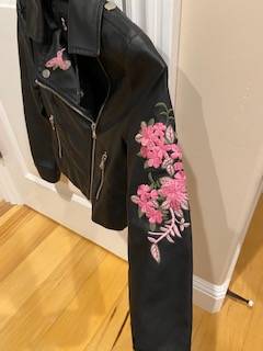 Girl's Black Leather jacket with Pink Floral Design is in like new condition. Girl's size small, like 7-8.