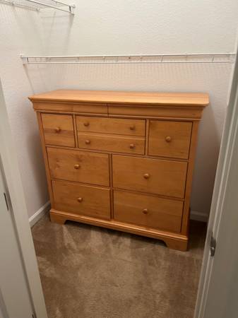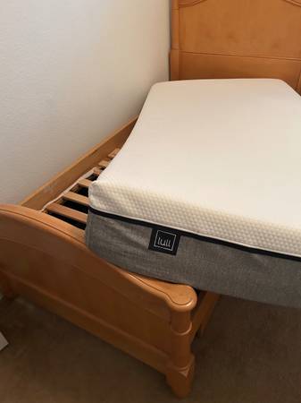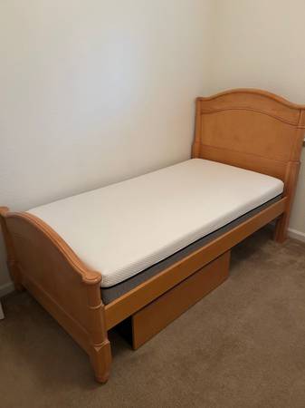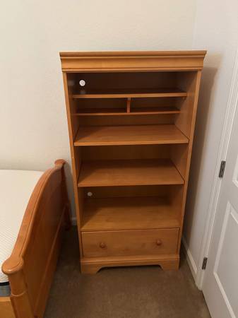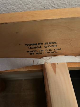 American made six (6) piece Stanley Furniture set with two (2) new Lull mattresses. From the Young America series, All wood. Includes two bed frame/headboards, two rolling storage drawers, one...
