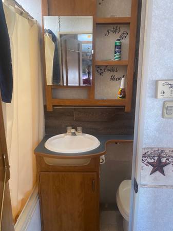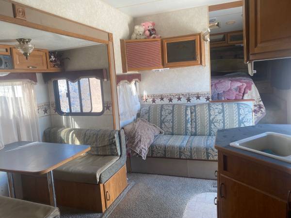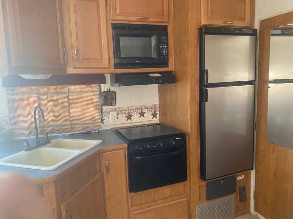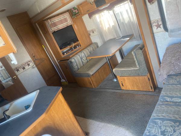 Hi, I have a fifth wheel camping trailer 2004 25 foot in good condition. Everything works very good. It has brand new tires brand new refrigerator and it has new batteries. It has one slide out fully self contained no problem whatsoever willing to trade for UTV or jet skis or a boat but they must be in really good condition because our trailer is in good condition or 6000 or best offer