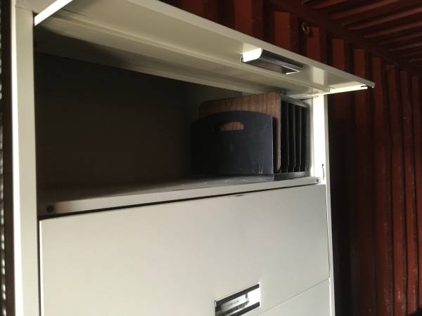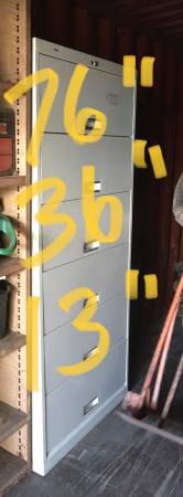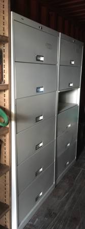 Hi, have two tan Hon metal 6 compartment receding door file cabinets. Doors flip up and slide back. Matching. Good condition. Measure 76 inches tall by 36 inches wide by 13 inches deep. Delivery extra. Thanks for looking