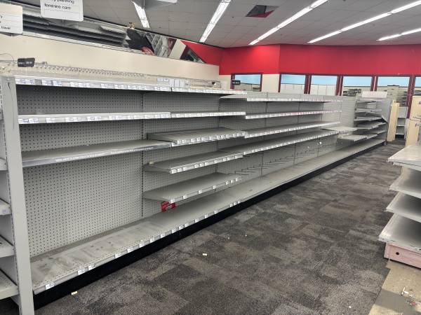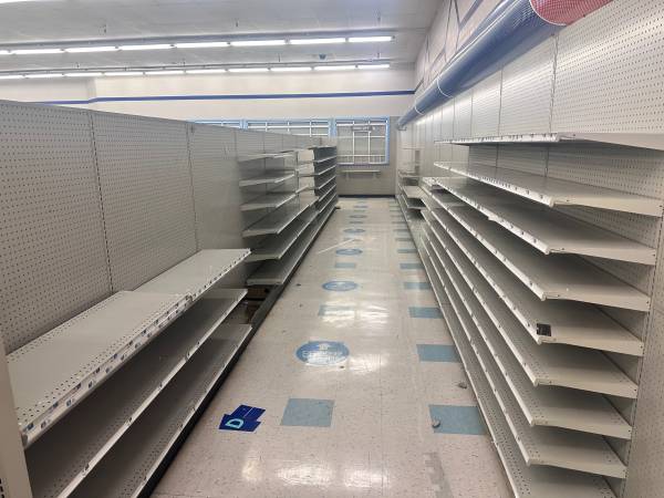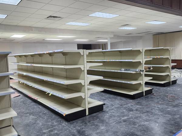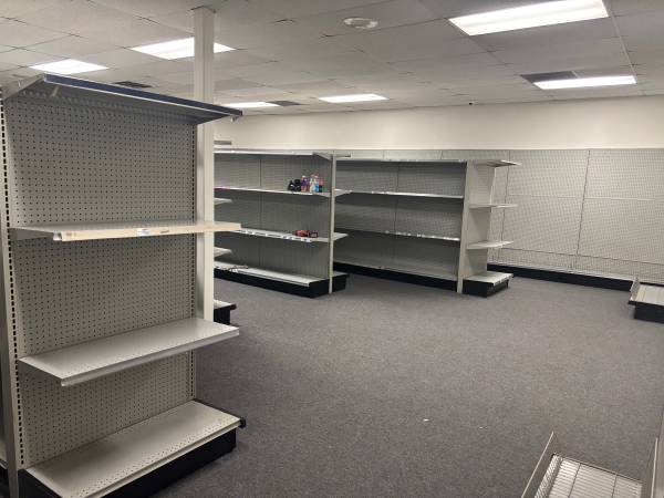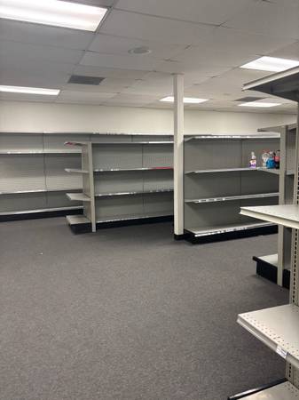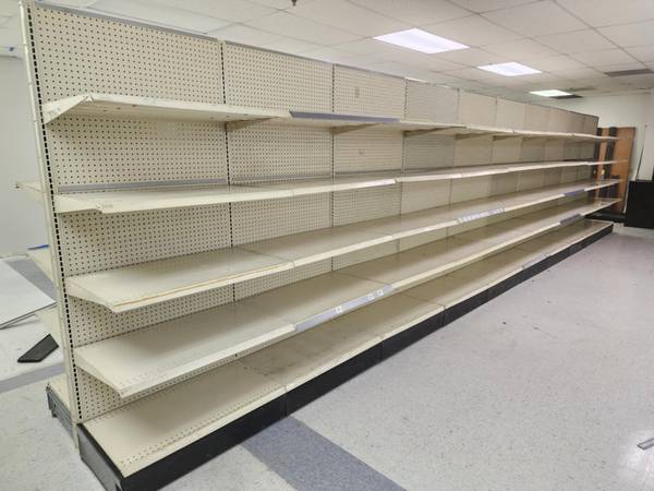 COMMERCIAL SHELVES, $25.00 FT SINGLE, WE HAVE 3 FT AND 4 FT LONG, IN GREY AND BEIGE COLORS, WE CAN DO DELIVERY, AND INSTALLATION AT AN EXTRA COST