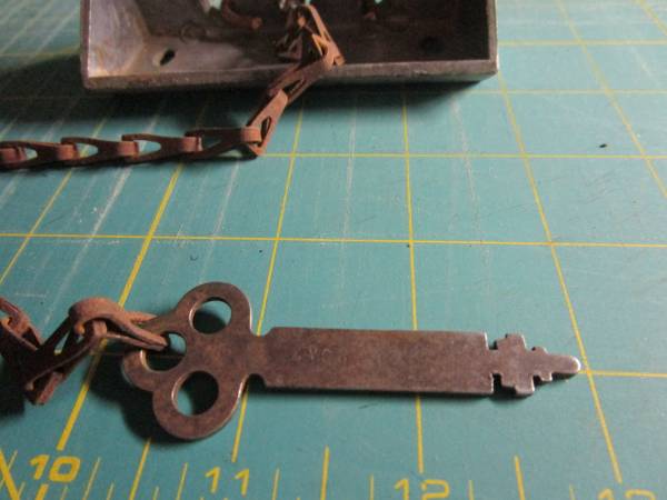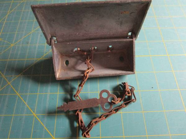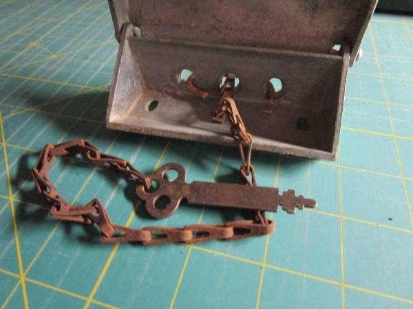 LATHEM WATCHMAN'S STATION - Box, Chain and Key Aluminum box - Measurements: 4 1/2" Wide x 2" deep x 1 1/2" tall when closed with Metal Chain and Key. Great for the She shed, Man cave, Garage, Office