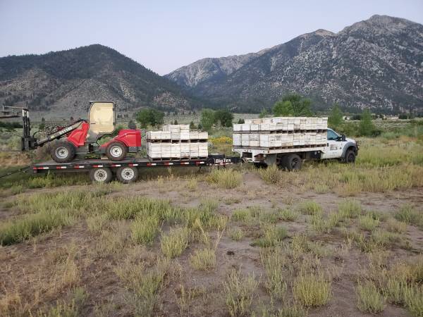 Equipment is organized for efficient loading, transport, feeding, and management. Truck and trailer set up for palletized hive movement.