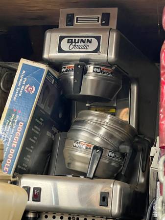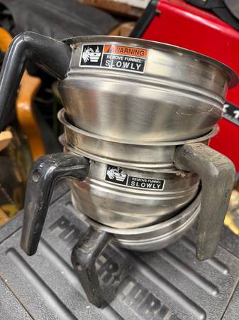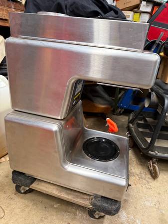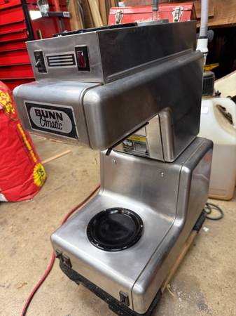 Very nice stainless steel Bunn O Matic commercial coffee brewer with 4 coffee ground pans. It is equipped with two warming plates, marked NSF on label. No brewing urns included Must clear my storage. Asking $95.