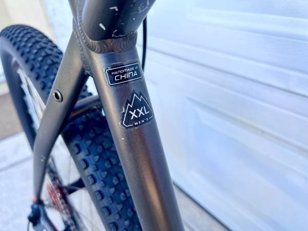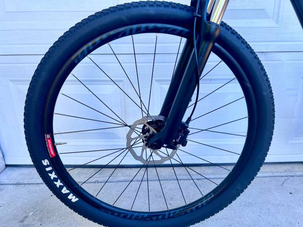 Upgraded wheels with front wheel being a Niner thru axle rim.