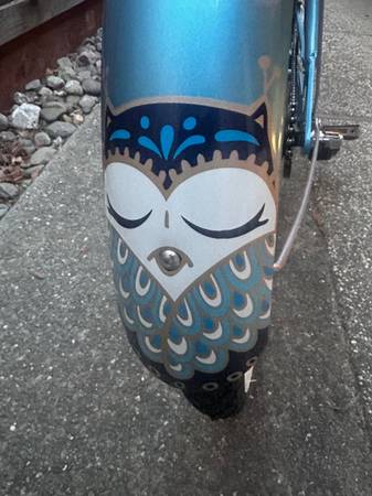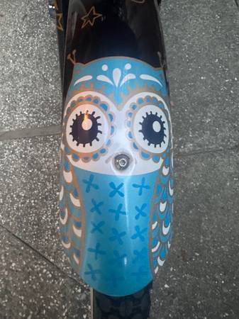 Great Christmas gift! The Night Owl features some of Electra’s most beautiful imagery. The bike is part of their "fashion cruisers" line and the graphics transition from a dark blue front fender, where the owl is awake at night, to a sky blue rear fender where the owl is asleep during the day. The bicycle was barely ridden, is in excellent condition, and features: