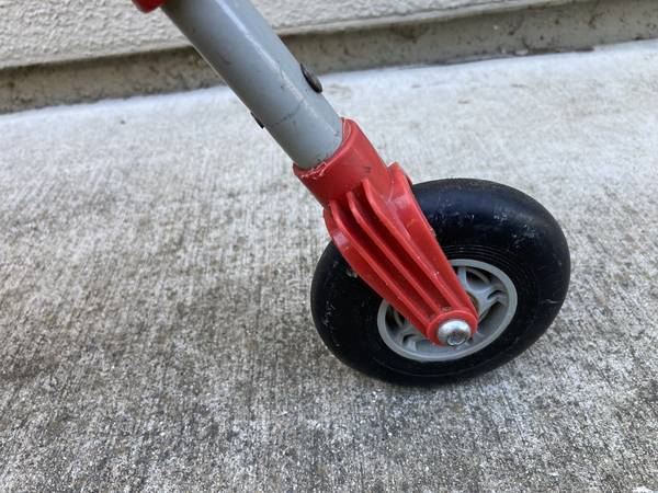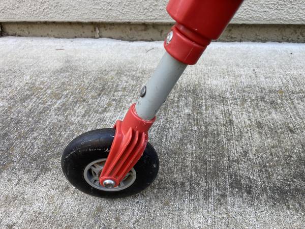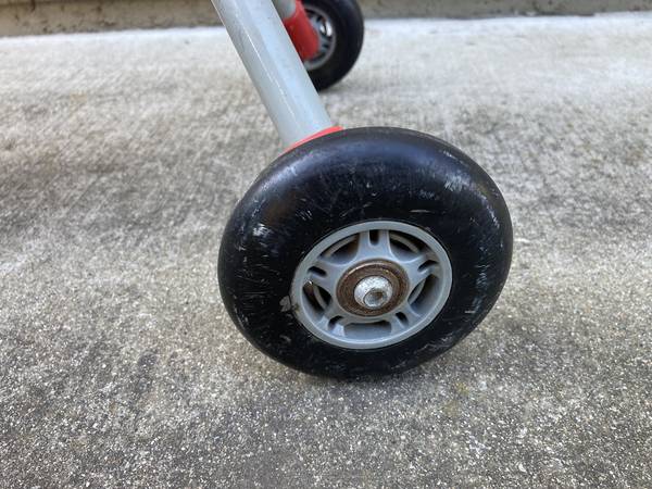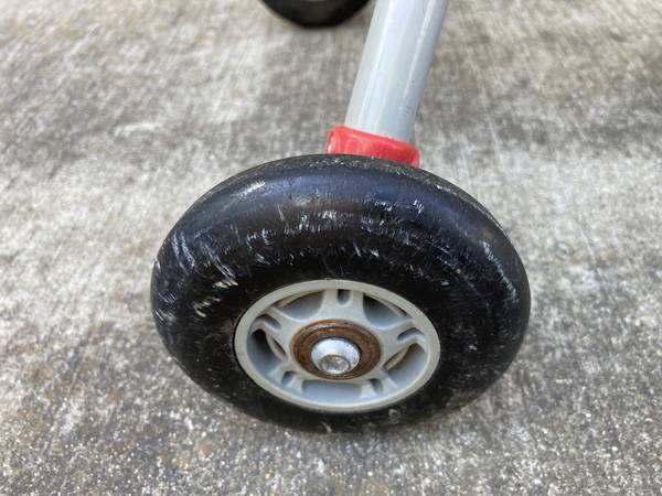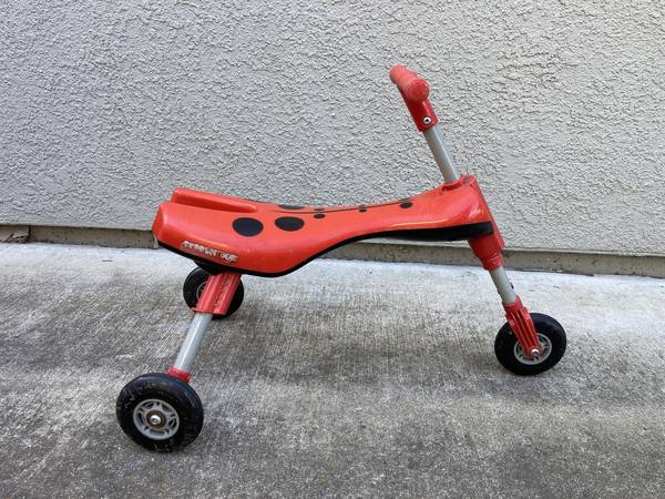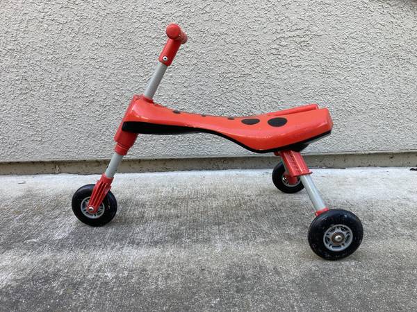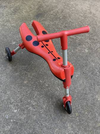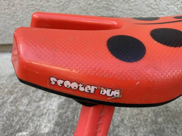 Give some wheels to your little ladybug with this toddlers' scooter! Wheels are solid rubber (so they never go flat!). This scooter shows signs of typical wear and tear. The colors are red and black.