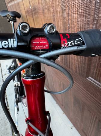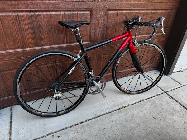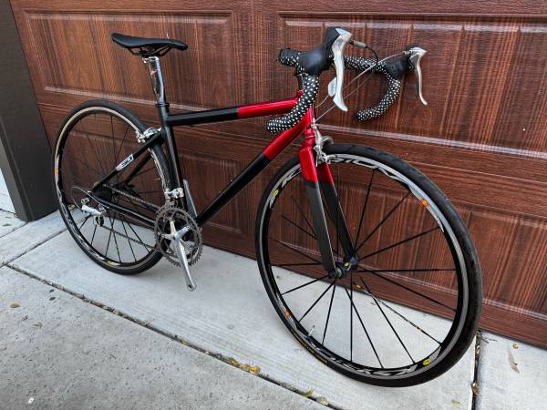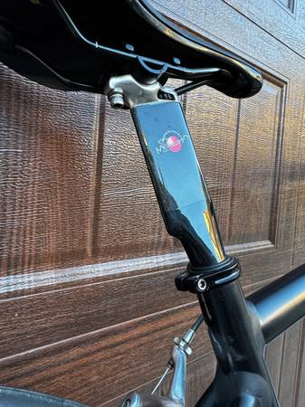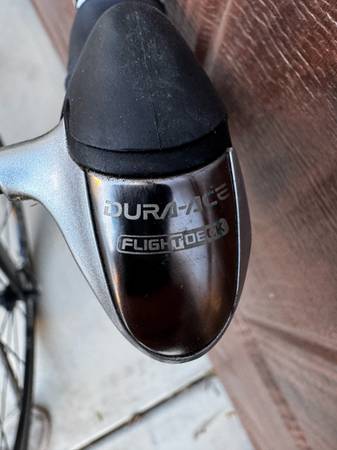 This is a Giant Zero TCR with decals removed. Very lightweight aluminum frame with carbon fork and aero seatpost, under 17 pounds w/o pedals. All Dura-Ace components (brakes, FR/RR derailleurs, 53-39 crank), Mavic Ksyrium SSC 700c wheelset with new Continental GatorSkin 28mm tires. Cane Creek headset with Cinelli Groove bars/stem. Very good condition, reliable, ready to ride. Was my 5’3” wife’s ride but she’s converted to e-bike.