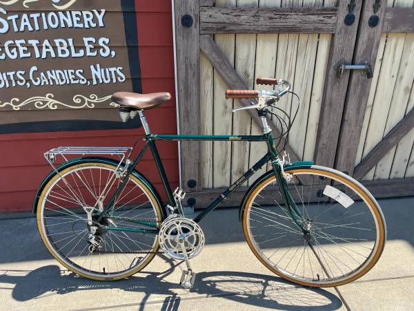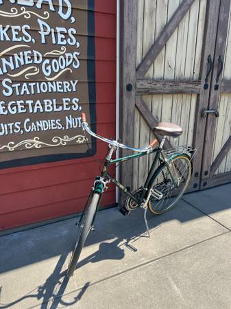 1980's Free Spirit Bike made in the USA by Sears & Roebuck Co. All original and rides and shifts great. Model is Greenbriair. Forest Green frame with Brown Grips and Saddle. Chrome Shimano drivetrain with full fenders and rack. Has a timeless look and would be great for Truckee, Tahoe, or a Coffee Cruiser. Light feather rust on chrome but still pops. Could use some fresh 26 1/38 Skinwall tires. See pics for amazing condition.