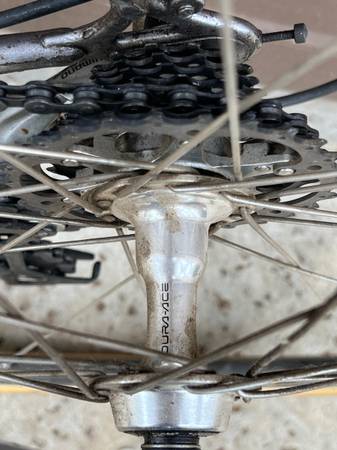 9 speed Dura Ace cassette has titanium cogs custom 13-27. This gearing combination gives you close spaced gears for any circumstance with lower gears for hills when you are tired. Ideal custom gearing for long endurance rides. I built this bicycle for riding centuries.