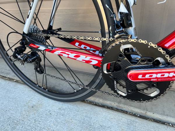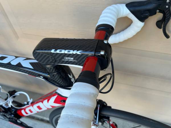 For sale is a beautiful condition Look 695 in a size Large, in the red, white, and 3k carbon weave finish. The Large equates to approximately a 56 or so. It has a 56.0 effective top tube, 170 head tube, and as shown measures 73.5 cm from center of crank to center of saddle rails. The bike was built as follows: