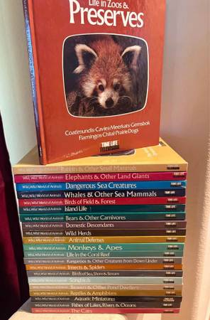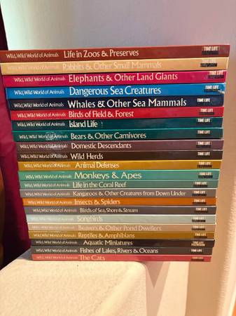 The "Wild, Wild World of Animals" books are a vintage collection of 22 nonfiction picture books published between 1976-1979 by Time Life Television. Each book in the set features a different mix of authors and focuses on various wildlife topics within the genre of animals. This nostalgic set offers readers a comprehensive look at the natural world through engaging narratives and stunning visuals. The books are near new. The bindings don't even feel like they have been open much. It's a beautiful set!!