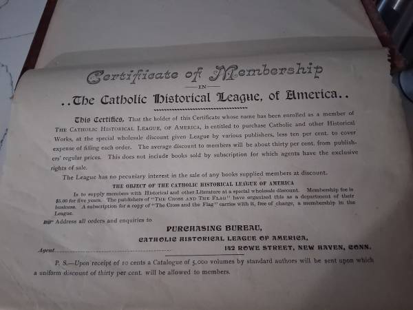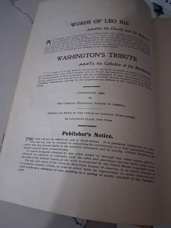 The Cross and The Flag - From the Discovery of America to the Dawn of the 20th Century. It was published around 1900 for the Catholic Historical League of America. The cover shows signs of wear and tear. The first couple of pages are loose, but all of the other pages are intact and in good condition.