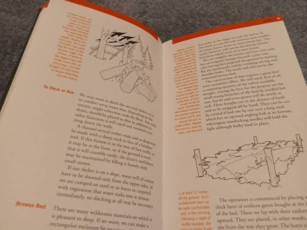 This is the very interesting and useful book titled "How To Stay Alive In The Woods". It is extremely helpful when giving information on first aid, edible plant identification, compass location, survival techniques, etc. This would be a great book for anyone that camps, hunts, bikes, fishs, or travels outdoors. This is the hardback first edition, that has a rubberized coating over the book to help make it weather resistant. A nice addition to any library.
