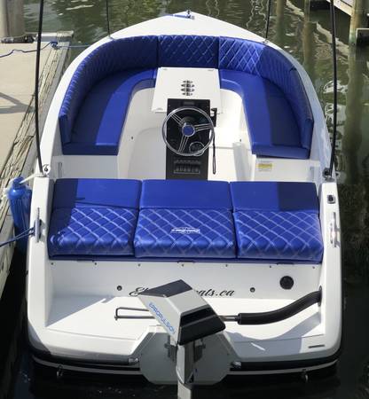 I'm selling my electric cruising boat, the VOLT 180 with pod propulsion & lithium batteries. This fully electric sporty looking boat offers luxurious comfort with leatherlike studded cushioned seating with back rests surrounding a corian table with holders for wine glasses, bottles and drinks and a bimini top for shade. The boat provides an incredibly smooth eco-friendly ride running 3 to 6 knots for gentle cruising. This boat directly contributes to zero pollution, zero emission and a noiseless environment allowing for a peaceful cruise on the water.