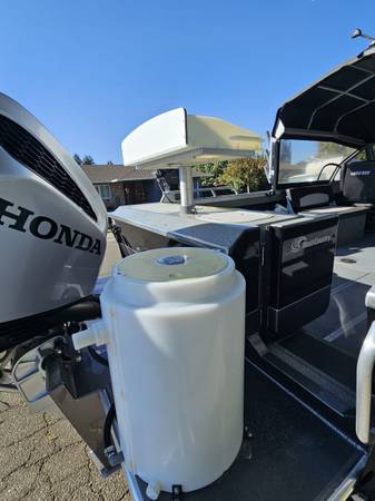 18 gallon round anchovy bait tank mounted on transom with quick release connections and plumbed to run off of factory bait tanks pump with 2 way control valve