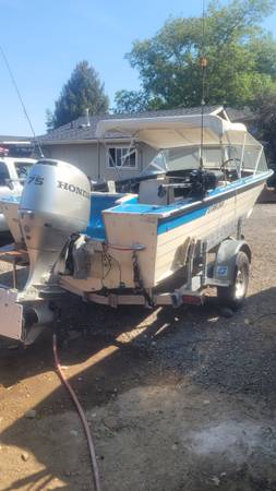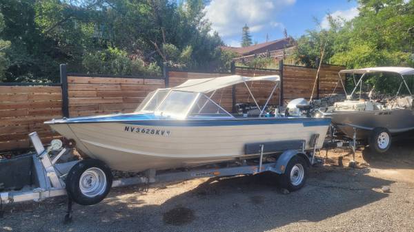 The blue and white one asking $7500: Nice 18' starcraft boat, very spacious, perfect fishing boat for our local lakes, pyramid stampede Davis etc. Also fun for summer cruising, has a swim dock on rear with ladder, and even has a ski pole that I don't believe was ever used.