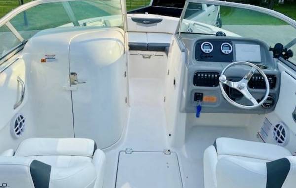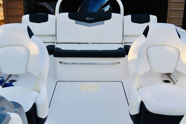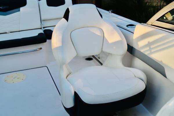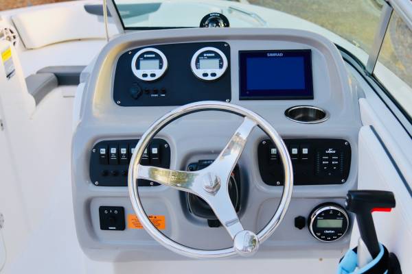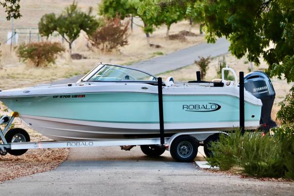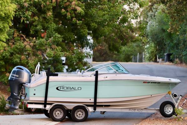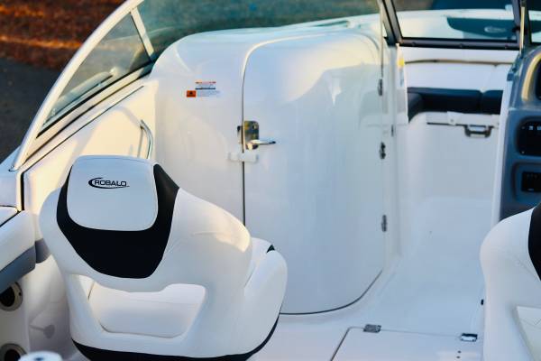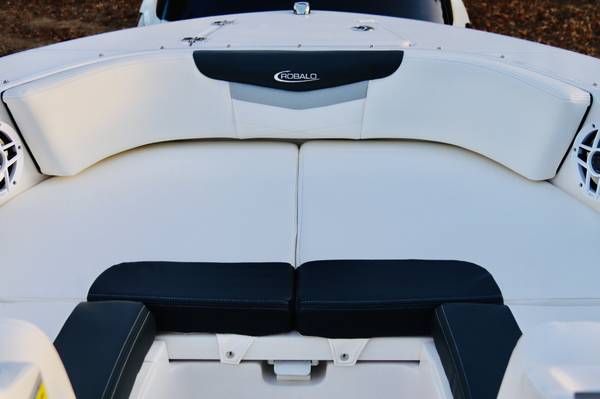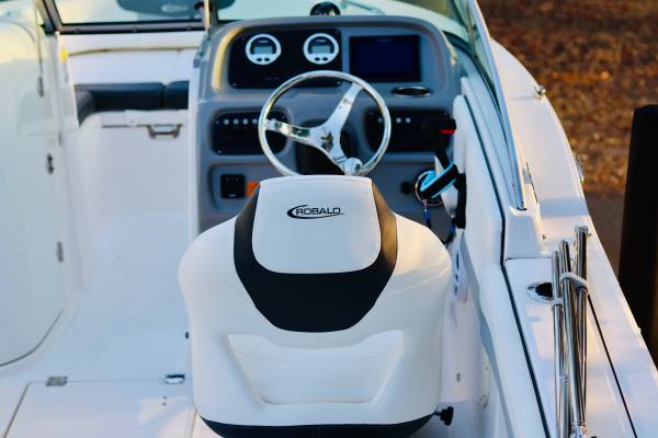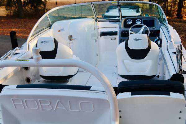 Gorgeous...Like NEW....We are second owner, purchased in 2023. Boat now has only 45 hours on motor. White interior with grey trim. Absolutely perfect inside and out. No visible wear at all. Every factory upgrade is on this boat including upgraded Yamaha F200XD 200HP four stroke motor with Integrated Hydraulic. Has a snap down bow and cockpit cover, trim tabs, porta pottie/lockable head department, LED lights, white powder coated ski tow, live well, washdown, Simrad chartplotter/fishfinder, bluetooth stereo, and more....The trailer is dual axel with step up ladder and diamond plate detail. Robalo makes a solid, quality made boat. ALWAYS stored indoors. Only used in freshwater. Must see in person.... Stunning!