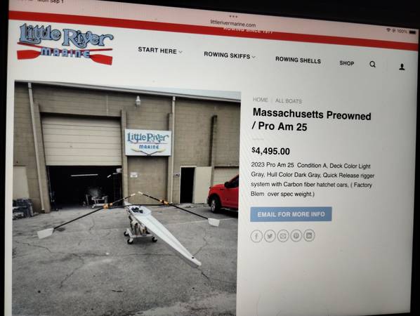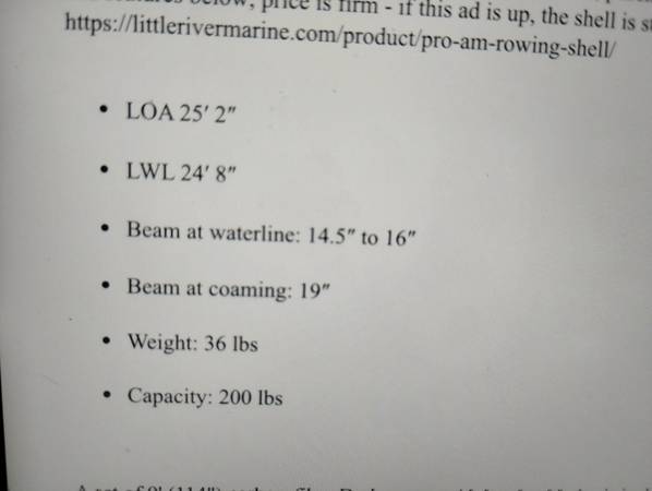 This 25’ Little River marine rowing scull is $1600.00, with a $1000.00 set of carbon fiber Dreher oars it's $2000.00, save $6062.50 off the new retail price of $6500.00( scull) + $1000.00 ( oars) =$7500.00+sales tax of $562.50=$8062.50