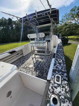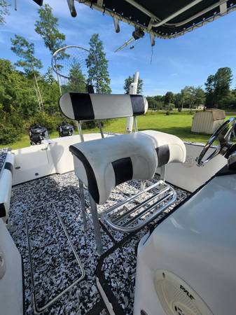 SeaDek flooring was added, along with updated lighting and batteries. Electronics include SIMRAD radar, GPS, fishfinder, and a VHF. Stereo has a sub and color-changing canopy lights. The hull was reinforced with carbon fiber and fitted with a keel guard.