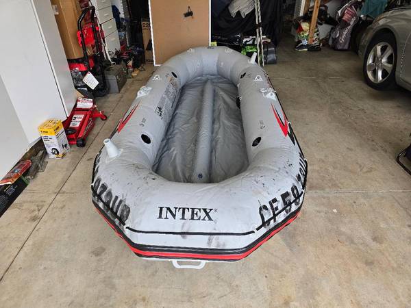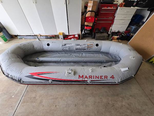 Intex Mariner 4 Raft Good Condition Inflatable Boat, New Minkota Motor 30lb thrust New Never Used Motor Mount Cushion, Oars, Registered, Floor board Slightly used ready for Spring and Summer! Ray...