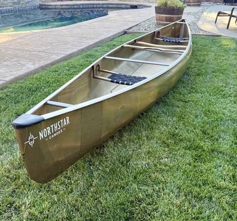 Northstar Canoe, Northwind 16. Aramid layup 42 lbs. This boat is 16.5 feet long, 32 inches beam at the gunwale, and 36 inches max. (Check out the Northstar Canoe website for exact details on specs, loading, and construction of this canoe). This boat is very balanced to paddle, tracks well and turns well. The boat is fun to paddle great for family day trips or camping. There are a few minor cosmetic scratches on the bottom. Sale will include two high quality Bending Branches paddles one 52" 14 deg and one 50" 14 deg. also includes a kneeling pad for solo paddling. Also included is a garage ceiling hoist for storage. (This boat is listed new for about $3400 on the Northstar website and the paddles are about $270 each. So with the kneeling pad and hoist system total value of the package is over $4,000.)