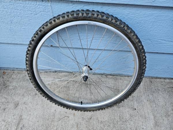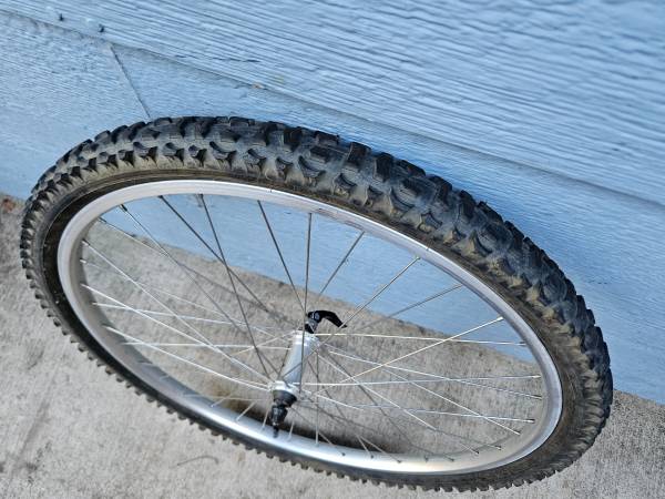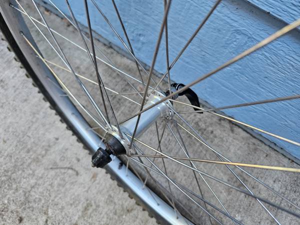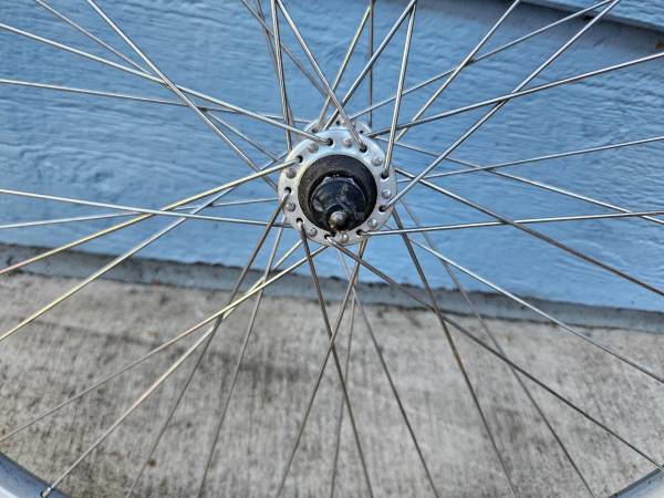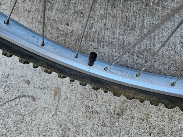 This wheel is in good shape, you can put it on a bike and ride. The tire is getting old and starting to crack, but still holding up well. The rim is a pretty nice Japanese-made Araya GP-710. I don't know the brand of the hub, the sticker has come off it.