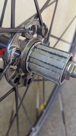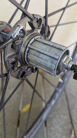 The rim brake track still have plenty of wear left. Reason for selling is because I don't use it anymore. It's about 5 years old, no crash, no dents, wheelset still roll smoothly. Freehub body shows little bite from the cassette.