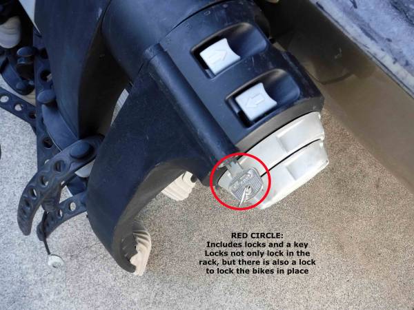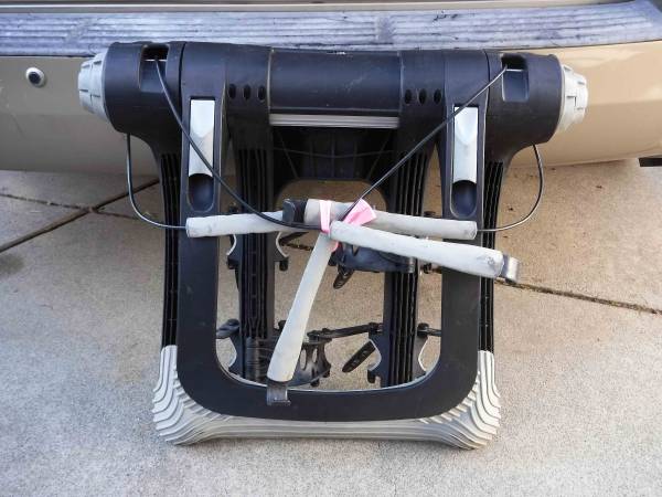 In Very good condition, Thule 9001 Raceway 2 bike trunk or rear door mounted carrier, complete with locks and key. Has anti-sway features which precludes bikes from hitting each other.