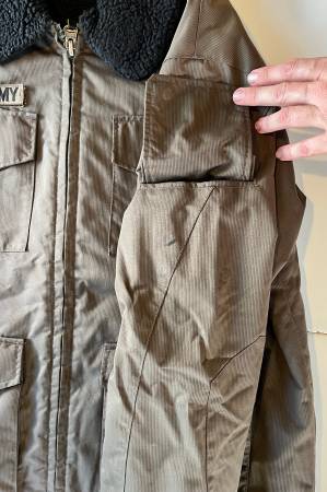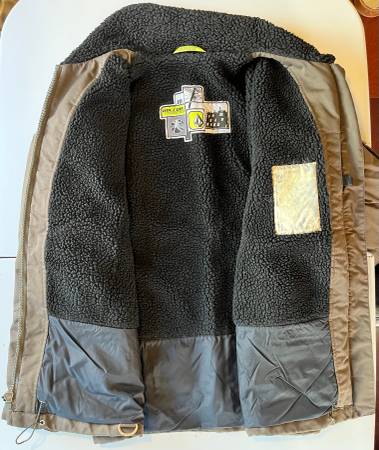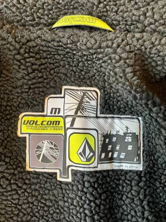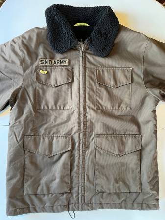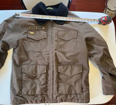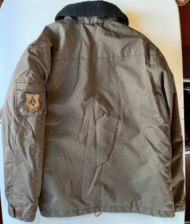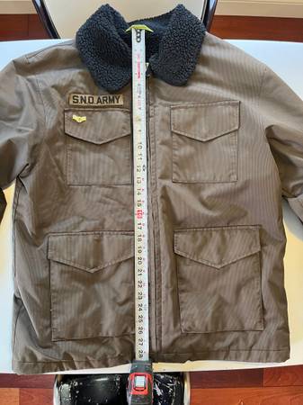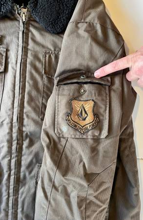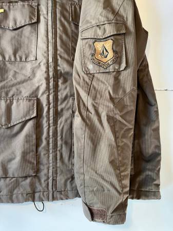 Volcom Sno Army miltiary-themed snowboarding skiing jacket, size medium, in a military brown color. Purchased around the year 2000. Washed and ready to wear, although I would recommend application of a weather-proofing product to increase water-resistance (original waterproofing has since worn off).