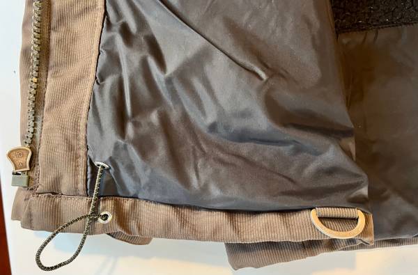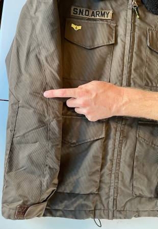Uses a combination of magnetic and snap button closures for pockets. Four outer pockets with additional hand pockets behind the bottom two pockets. One inner pocket. Loop ring for ski lift pass attachment. Drawstring bottom closure option to keep the snow out. Removable "Sno Army" badge (Velcro).