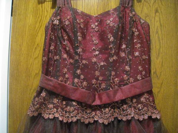 New with tags Blondie Nites Linda Bernell Red Burgundy Chiffon Prom Formal Ball Gown Dress Size 6. The first picture shows the real color. I added the straps only using pins you can ware it as strapless.