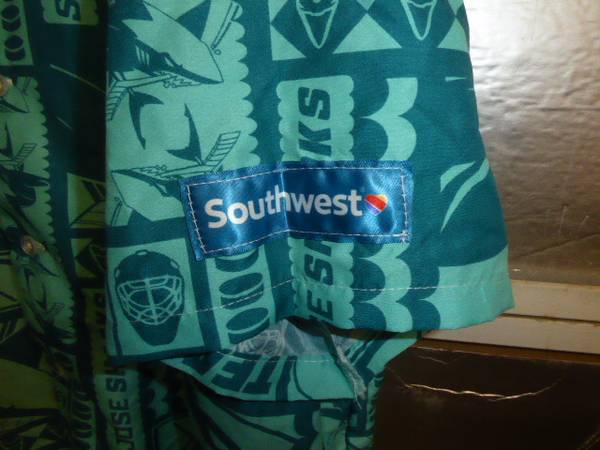 This is a men's Southwest Airlines San Jose Sharks Shirt - Size XL. 100% polyester. Made in China. NO stains/tears/rips/holes/damage. Teal in color. All buttons are present. $10. It is in Penryn....