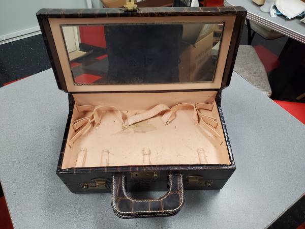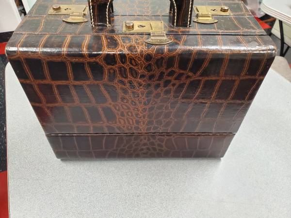 Faux alligator / crocodile outer cover with no delaminations or tears. Two compartments with pink fabric lining which does have a few age spots, but is intact. The top compartment has the remenants of a paper lable. Sorry, no key.