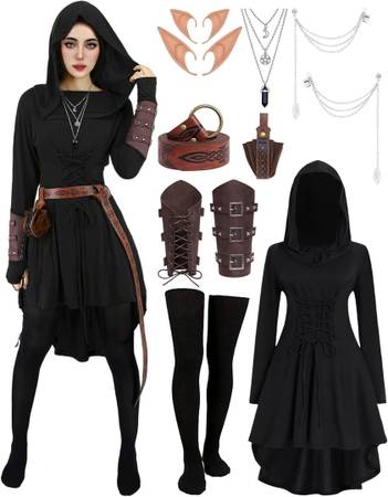9 Pcs Women Renaissance Dress with Hood Adult Medieval Fairy Elf Costume Archer Cosplay Outfit Halloween Costumes (Medium, Black)- $39.99