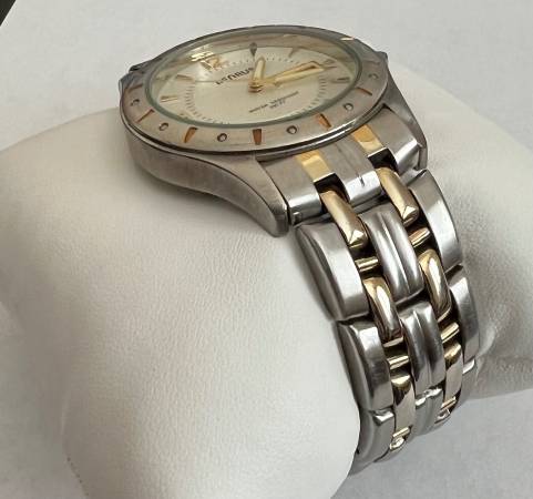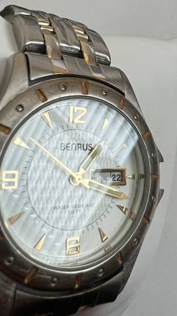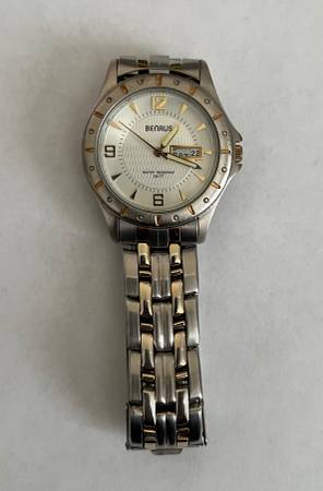 Benrus Men’s Watch Day Date Two Tone BN6011 138 PC33 Japan Water Resistant Wear on band Max wrist size ~17.5cm Small scratch pictured on crystal Works New battery Pillow for display only (not...