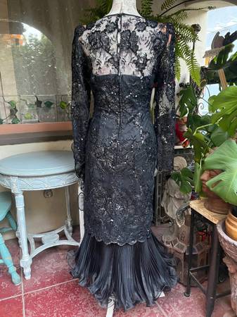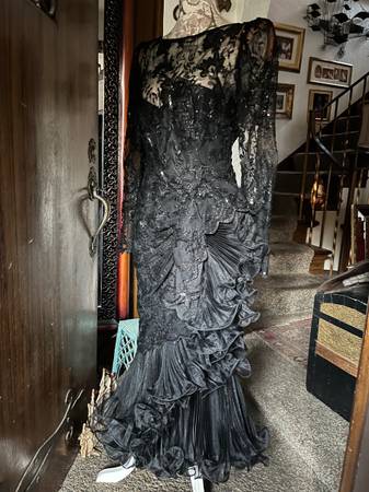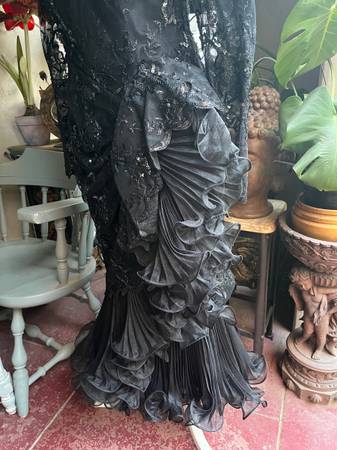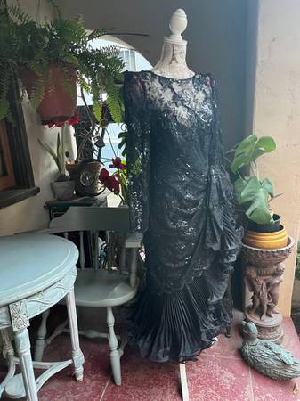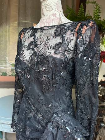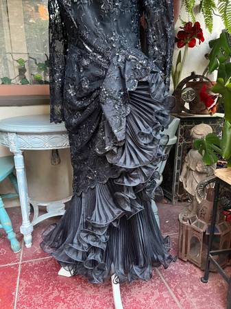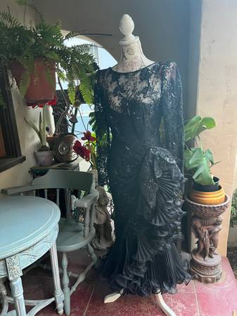 Exquisite vintage black lace, sequined evening dress with a Latin salsa flamenco dance flair.