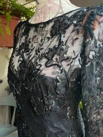 This dress has beautiful beadwork all over the black lace bodice and extends all over the dress. Elegant dress has a boat neckline with long sheer sleeves. The sweetheart bodice underneath is strapless. Fitted waist and fully lined.