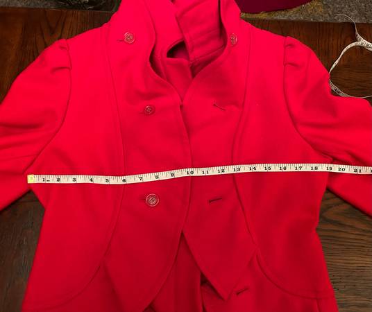 Neckline and wavy ruffled sides are accented with large red buttons with faux buttonholes. This quality of jacket is getting more difficult to find.