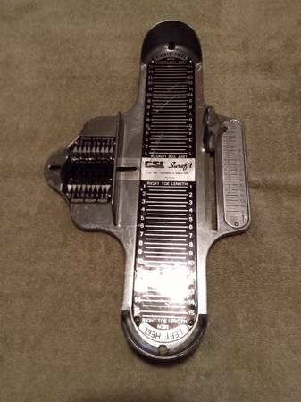 This is a metal vintage CSL Surefit Footwear Measuring Device for Feet/Shoes. It can measure the right and left feet, a long with width and arch of feet. A very nice item to have, if you have a shop or are into collecting shoes or footwear. The company was CSL Inc. out of Chicago, Illinois.