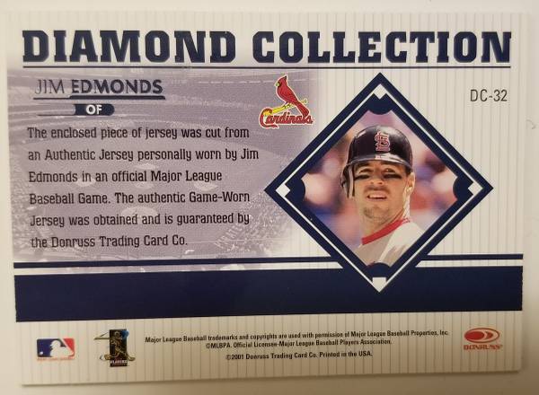 2001 Donruss Studio Diamond Collection Jim Edmonds #DC-32 baseball card piece of authentic game worn jersey