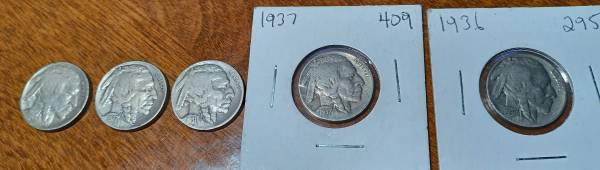 Five early Buffalo Nickels coin for sale From left to right in picture 1916 D, 1927 P, 1931 S, 1937 P, 1936 P All coins are in good condition for their age. $20 for all 5 coins EDH Coins