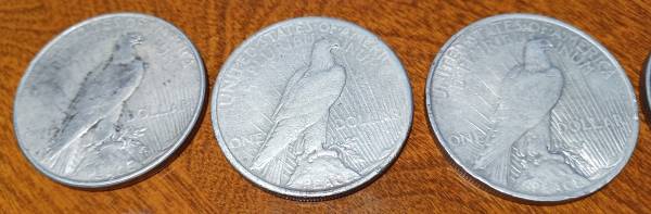 5 old Liberty Peace Head Silver Dollar coin. From left to right 1923 D, 1922 S, 1923 P, 1922 P, 1922 P $170 for all 5 coins EDH Coins